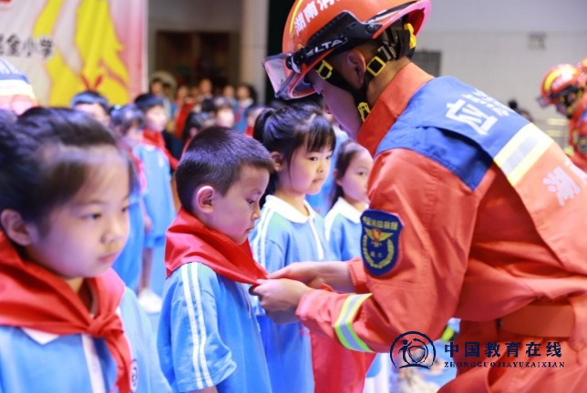 队歌响起,全场肃立,消防战士、学校领导、老师们逐一走到新队员面前,为他们佩戴上红领巾,鲜艳的红领巾,象征着他们正式成为少先队的一员,新队员们难掩兴奋,全场师生共同见证了这一激动人心的时刻。