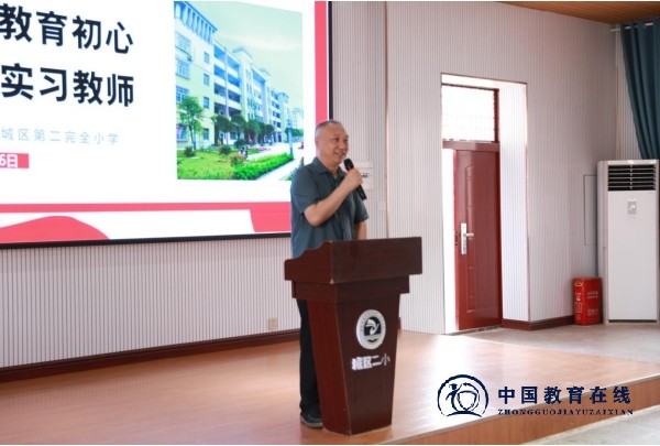 党支部书记、校长张克家同实习老师分享了蔡元培与陈独秀的故事,他表示,好的学校只是一个起点,未来怎样决定于自己,人生是一个长跑,当教师也是,他还送给实习教师一段话:“有匪君子,如切如磋,如琢如磨。”希望实习老师在城区二小里不断打磨自己,追求进步。