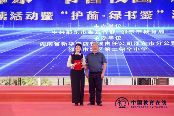 省、市级“书香校园”授牌仪式在众人的见证下拉开了帷幕,城区二小党支部书记、校长张克家从刘家豪手中接过了“湖南省书香校园”这一份沉甸甸的荣誉,城区二小也成为全市唯一获此殊荣的学校。