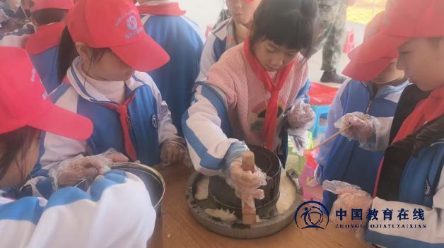 创意工坊内,劳动的快乐在指尖悄然绽放:扎染课上,孩子们捧着亲手染就的布料相互展示,靛蓝底色上晕开的星点花纹,每一块都是独一无二人的创意惊喜;漆扇课上,素白扇面在笔尖下渐次铺展山水、花鸟,传统美学的温润质感在掌心静静流转;树棍面包制作现场香气四溢,四年级学生将面团细心裹在树棍上,凑近炭火耐心烘烤,金黄酥脆的面包出炉时,咬下的每一口都是劳动馈赠的甘甜。打糍粑的木槌声、磨豆浆的石磨声交织成欢乐的田园旋律,做桑叶粑粑的软糯香气里,孩子们细细品味着传统美食的烟火气息与匠心传承。