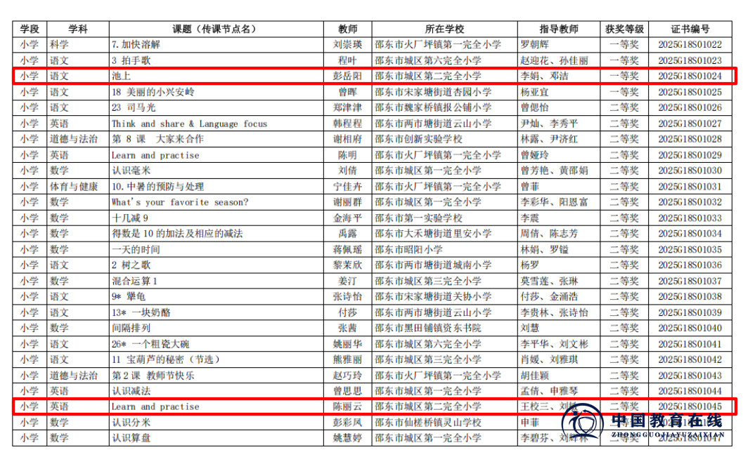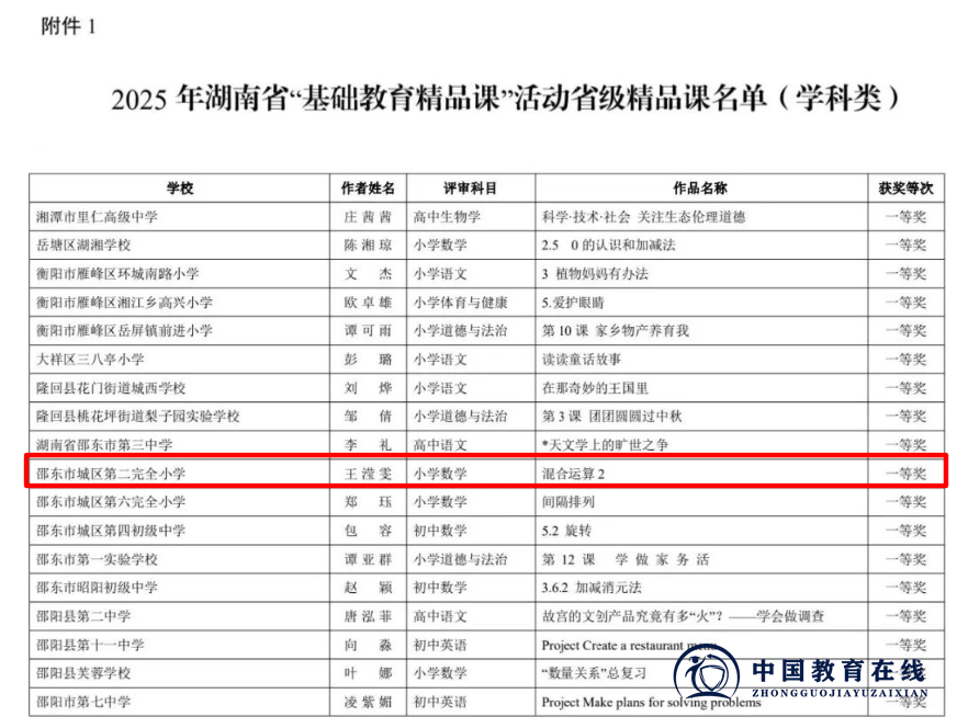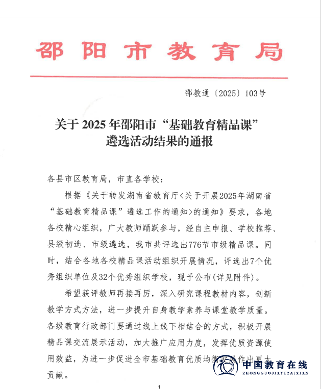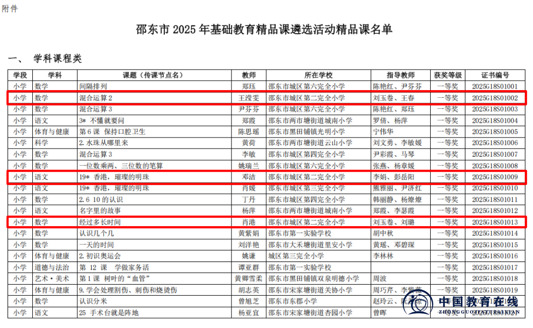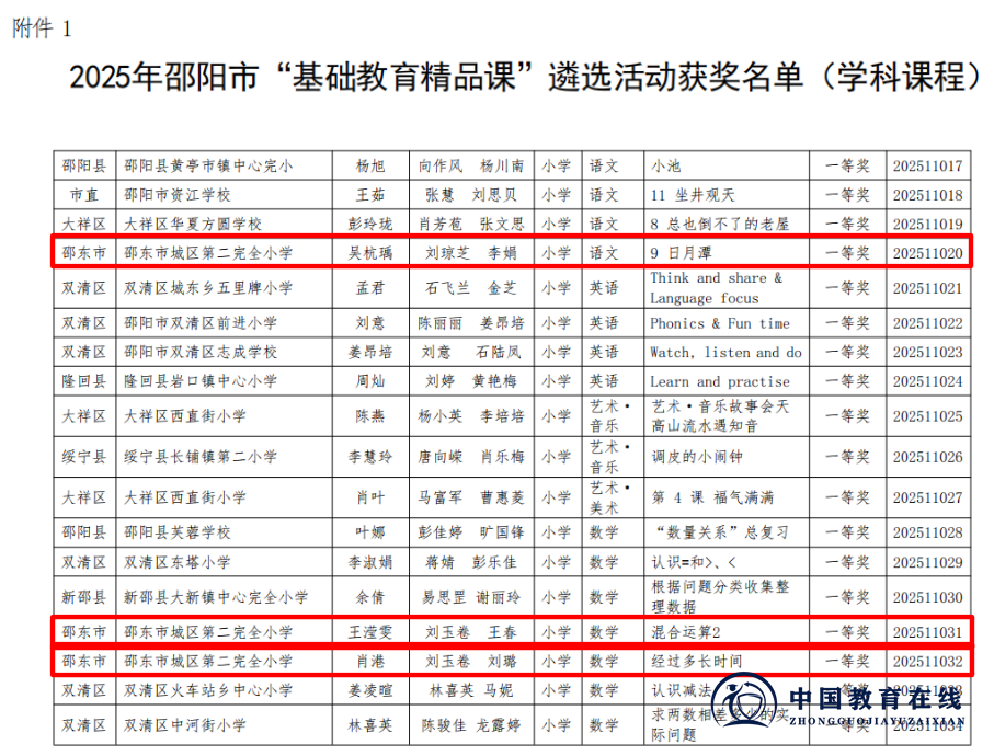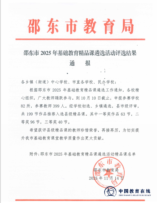 近日,2025年湖南省、邵阳市及邵东市“基础教育精品课”遴选结果相继揭晓!邵东市城区第二完全小学的老师们凭借扎实的教学功底与创新的课堂设计,在层层严苛评选中脱颖而出,揽获省、市、县三级多项荣誉,用实力书写教育荣光,特此向全体师生、家长及社会各界报喜!