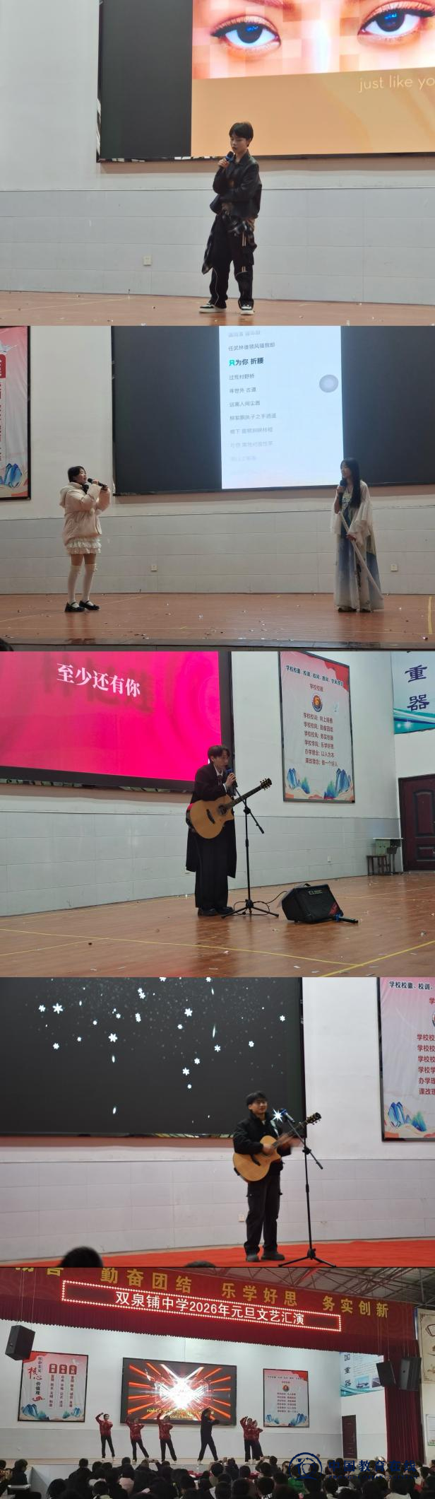 在辞旧迎新的美好时刻,为丰富校园文化生活,营造积极向上、健康文明的校园艺术氛围,2025年12月31日下午,双泉初级中学全体师生欢聚一堂,在学校礼堂隆重举办了2026年元旦文艺汇演。活动在欢声笑语与热烈的掌声中圆满落幕,为全体师生献上了一场精彩纷呈的视听盛宴,更为崭新的2026年注入了蓬勃的生机与希望。