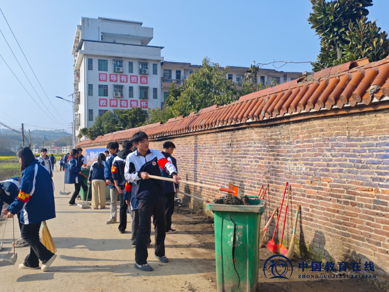 动员结束后,师生们迅速分组、领取扫帚、夹钳、铁铲、撮箕等清洁工具,奔赴划定的责任区域开展清扫工作。大家分工协作、相互配合,不放过任何卫生死角:绿化带边,同学们俯身拨开枝叶,细致排查每一处角落,将隐匿其中的烟头、纸屑、塑料瓶逐一捡拾入袋;校门前的沟坑与道路缝隙间,大家手持扫帚、铲子,合力铲除堆积的落叶、淤泥与顽固尘土;垃圾桶周边,同学们一边清理散落的垃圾、整理归置杂物,一边用水桶冲刷异味,让周年环境焕然一新。清扫过程中,同学们不怕脏、不怕累,认真做好每一处清洁,鲜艳的校服与醒目的志愿袖章相互映衬,成为乡间村道上一道灵动又温暖的风景线。