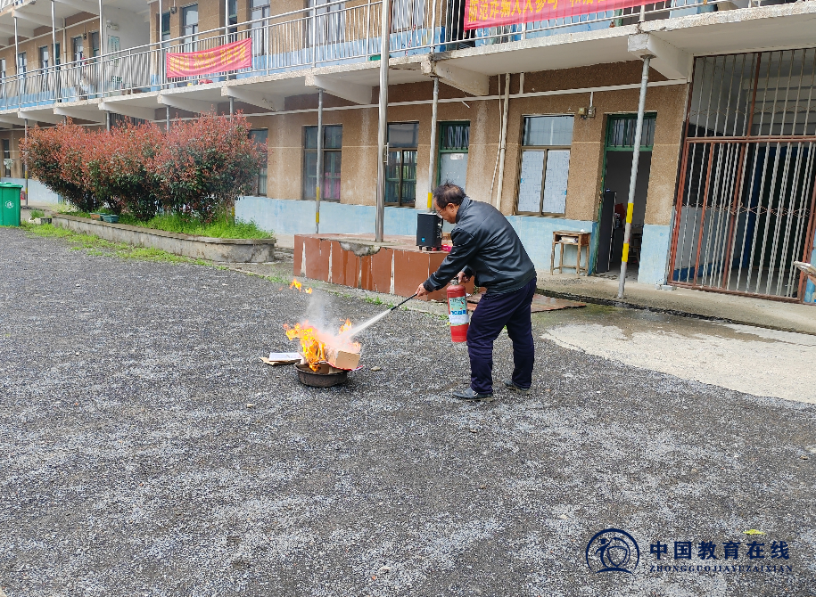 第三项为灭火器使用演示环节,校长李建云现场拿出干粉灭火器,按照提、拔、握、压的标准操作步骤,一步步为师生们进行示范。他详细讲解提灭火器、拔保险销、握喷管、压手柄的操作要领,同时重点说明灭火时要站在上风位置、对准火焰根部喷射等关键要点,直观清晰地展示了灭火器的正确使用方法,让全体师生看得明白、学得透彻。