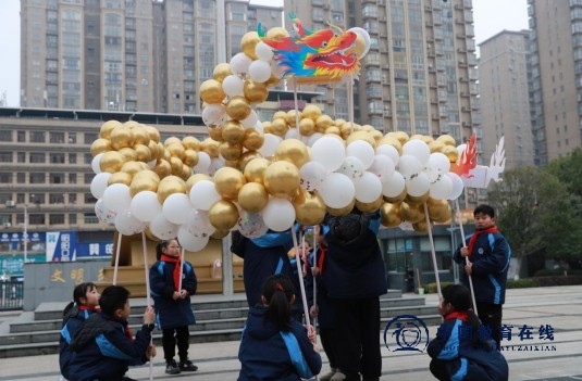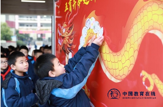 典礼上的几条“龙”吸引了在场师生的目光。一条“龙”神气十足地“盘踞”在画栏里,孩子们欣喜地将“龙鳞”贴在了它的身上,五颜六色的龙鳞上也装满了家长的祝福,而后,孩子和张克家校长共同为“巨龙”点睛。